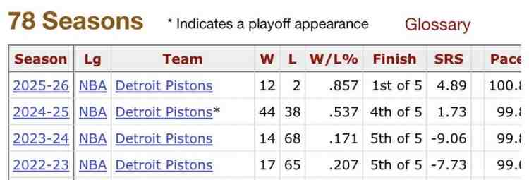 活塞23-24賽季曾經(jīng)歷28連敗,最終戰(zhàn)績(jī)只有14勝68負(fù)。