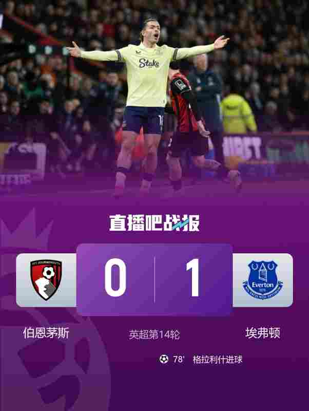 五輪不勝!伯恩茅斯0-1埃弗頓 格拉利什遠射制勝斯科特解圍中楣