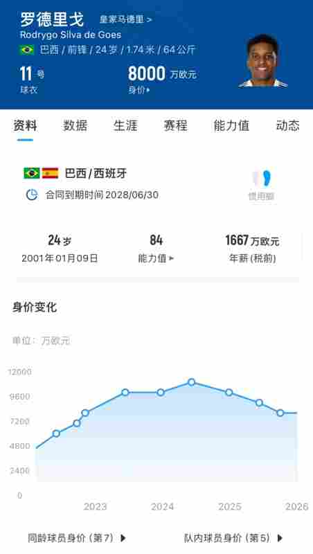 本賽季羅德里戈遲遲無法得到重用,多數時候是作為維尼修斯的替補出場。羅德里戈與皇馬的合同2028年到期,他現身價8000萬歐,年薪1667萬歐在隊內排名第五。